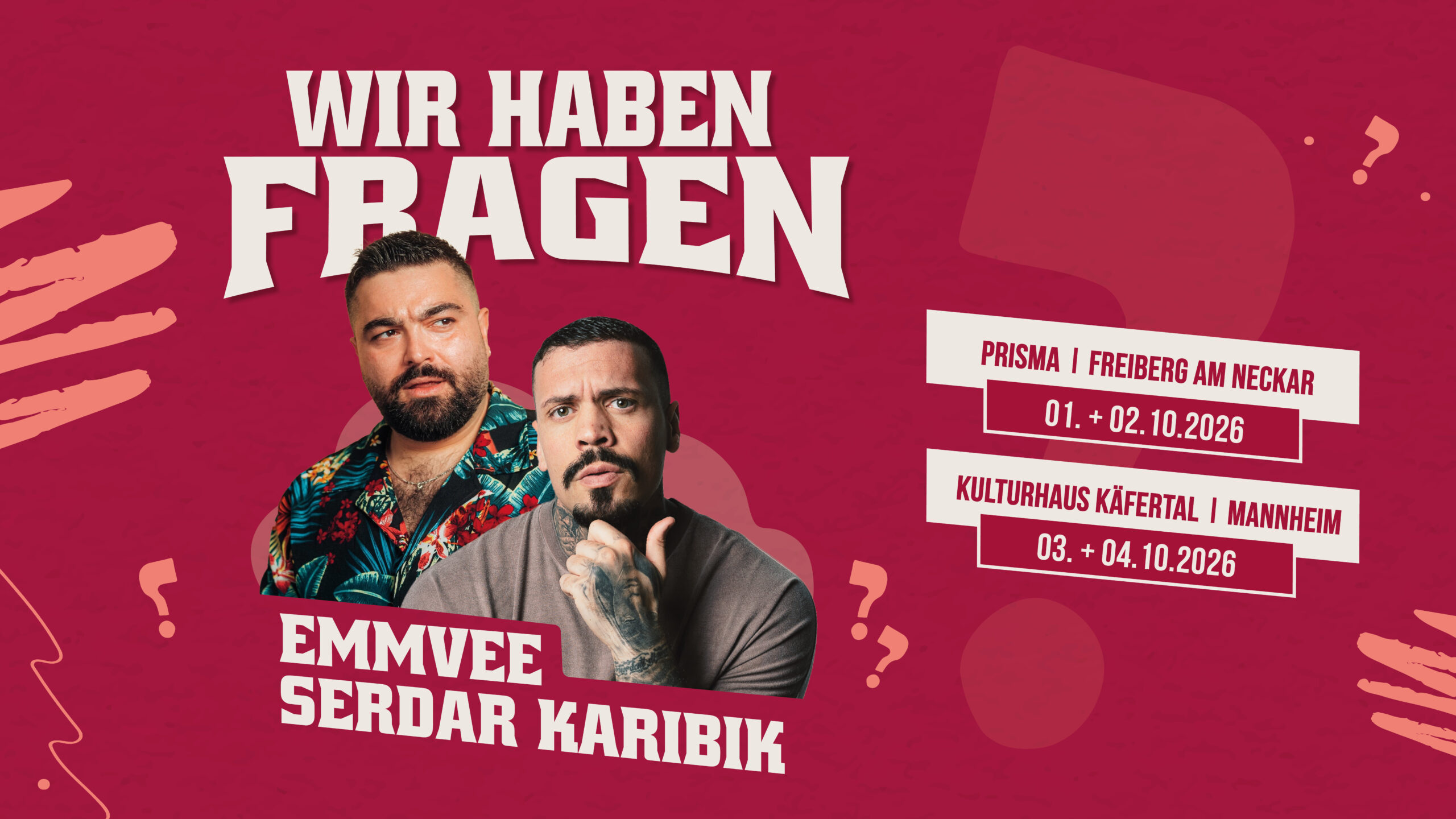 Wenn spontaner Schlagabtausch auf messerscharfe Beobachtung trifft, bleibt kein Platz für Langeweile. EMMVEE und Serdar Karibik gehen gemeinsam auf Tour – mit einem Crowdwork-Special, das so einzigartig ist wie das Publikum selbst.