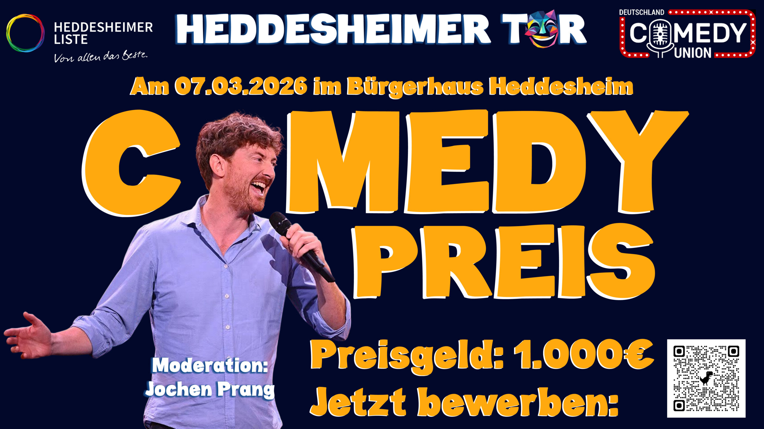 Durch den Abend führt Jochen Prang (bekannt aus dem Quatsch Comedy Club, Nightwash oder auch als Moderator vom ZDF Chaos Comedy Club).